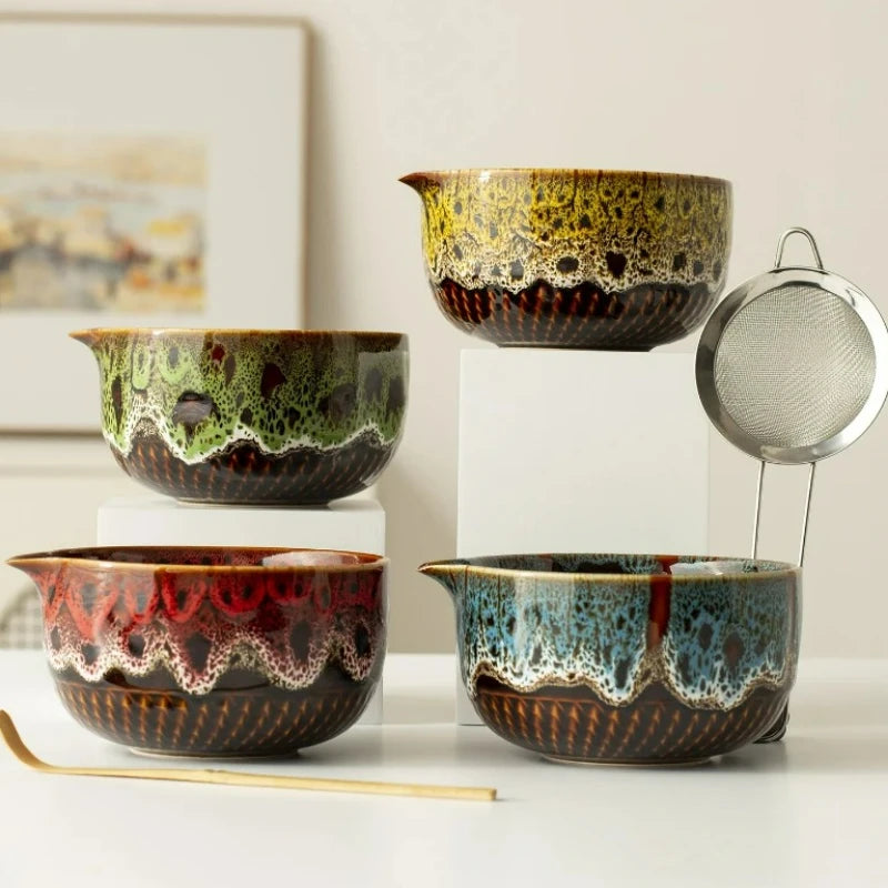 Designed for home matcha preparation, this set includes the core accessories needed to prepare smooth, well-mixed matcha with consistency. The matcha bowl is shaped to support effective whisking, while the bamboo whisk helps create a fine, even foam. A bamboo scoop allows for measured serving, and the stainless steel sieve supports a smoother texture by filtering fine powder before whisking.