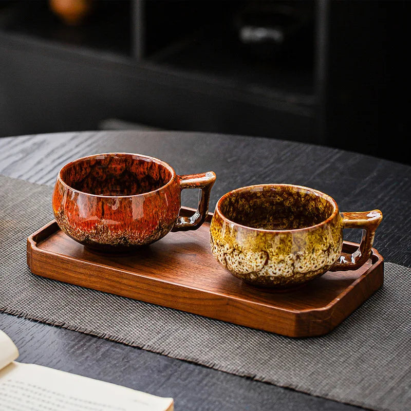 The Akiro handmade textured glaze ceramic coffee mug set features a rounded shape and a layered glaze finish that gives each cup a distinctive look. The comfortable handle and balanced design make the mugs easy to hold, making them suitable for everyday tea and coffee.