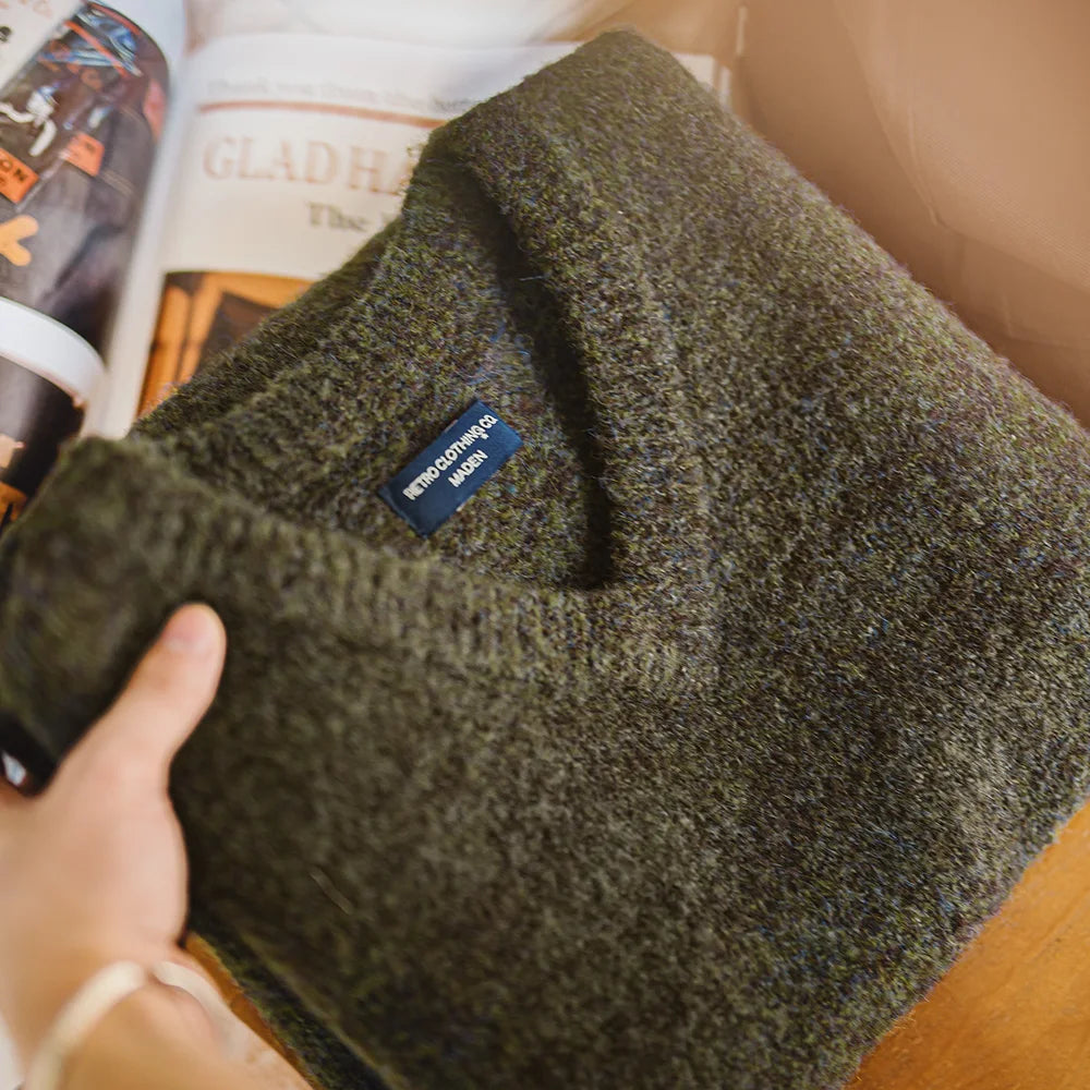 Knitted in a soft marled forest green, the textured finish adds depth and character without feeling heavy. Ribbed trims provide a clean, structured silhouette, while the versatile cut makes it an essential for transitional dressing and autumn layering.