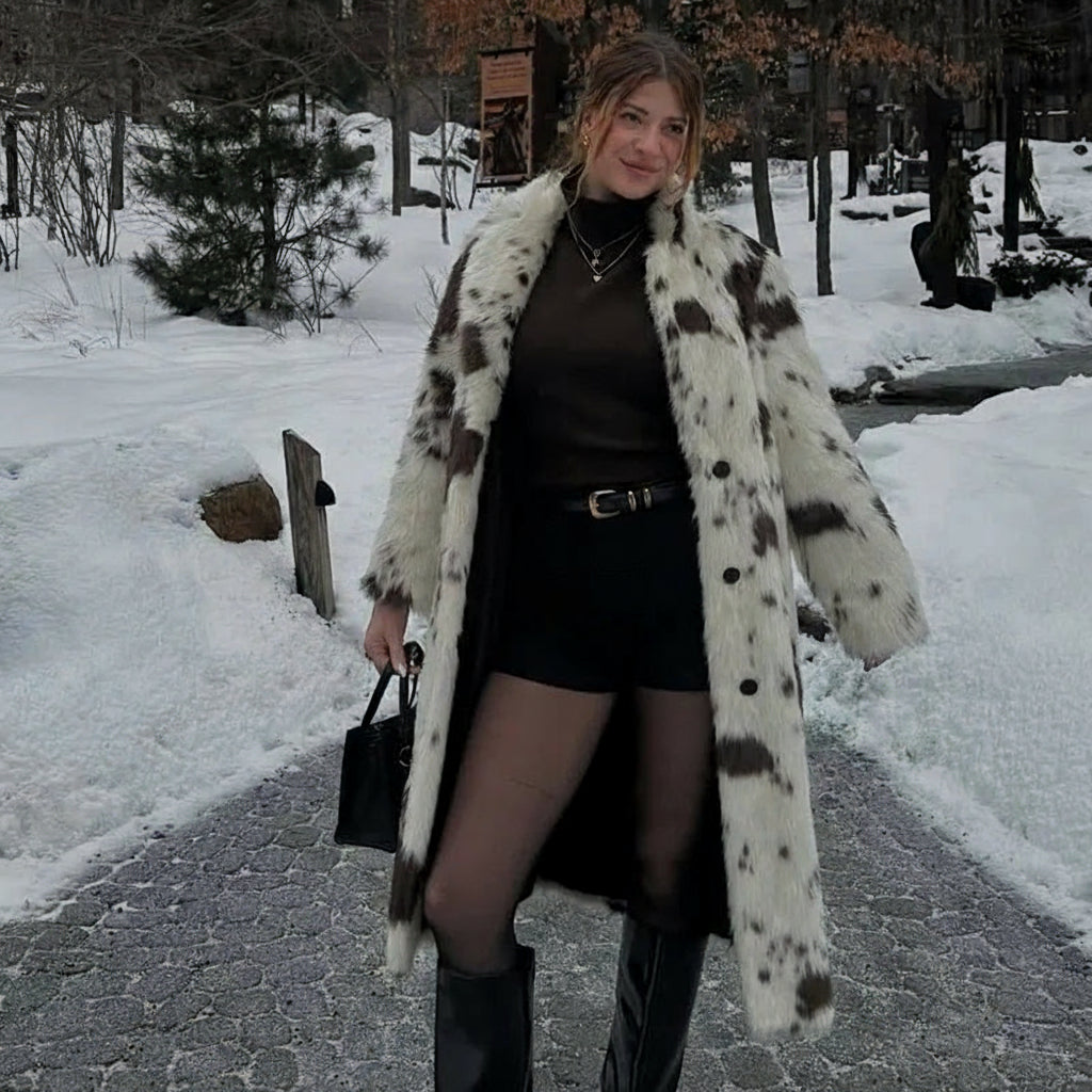 The Carmisse long faux fur coat makes an unforgettable statement in luxury winter outerwear. Designed in a bold animal-inspired cow print, it blends high-fashion impact with indulgent warmth. The plush longline silhouette, oversized fit, and wide lapel collar create a glamorous shape that adds instant polish to every look.