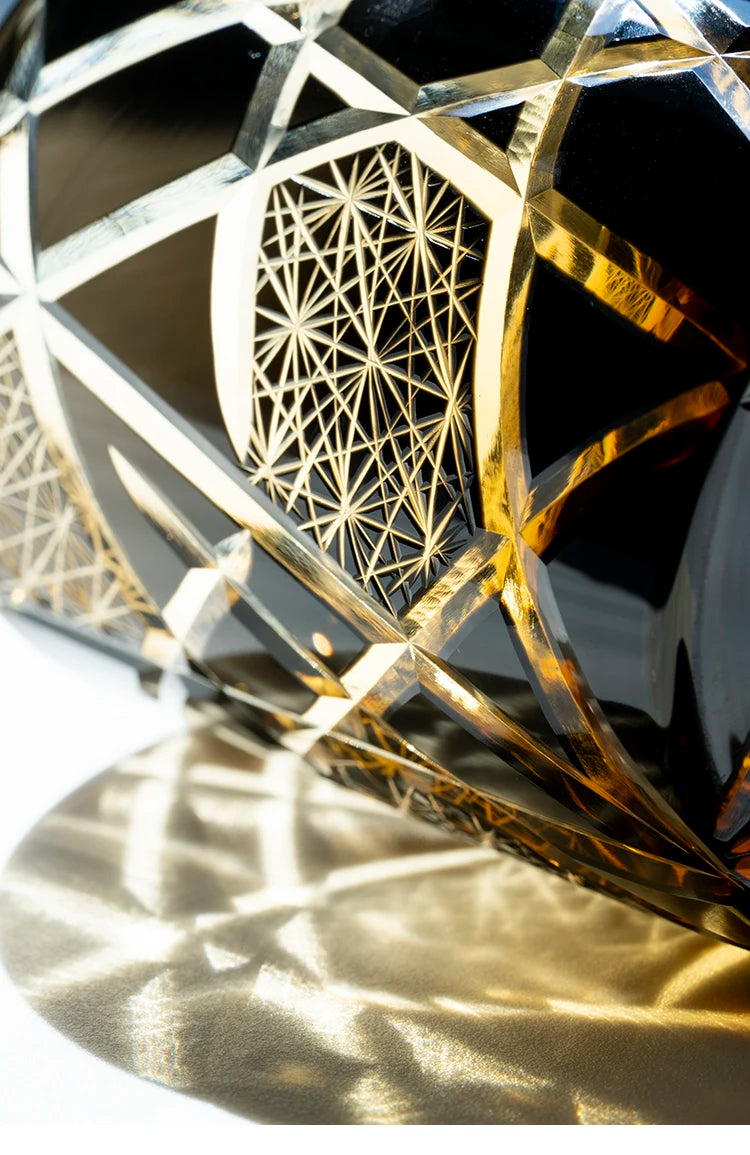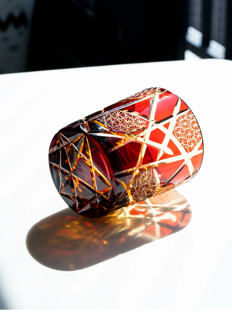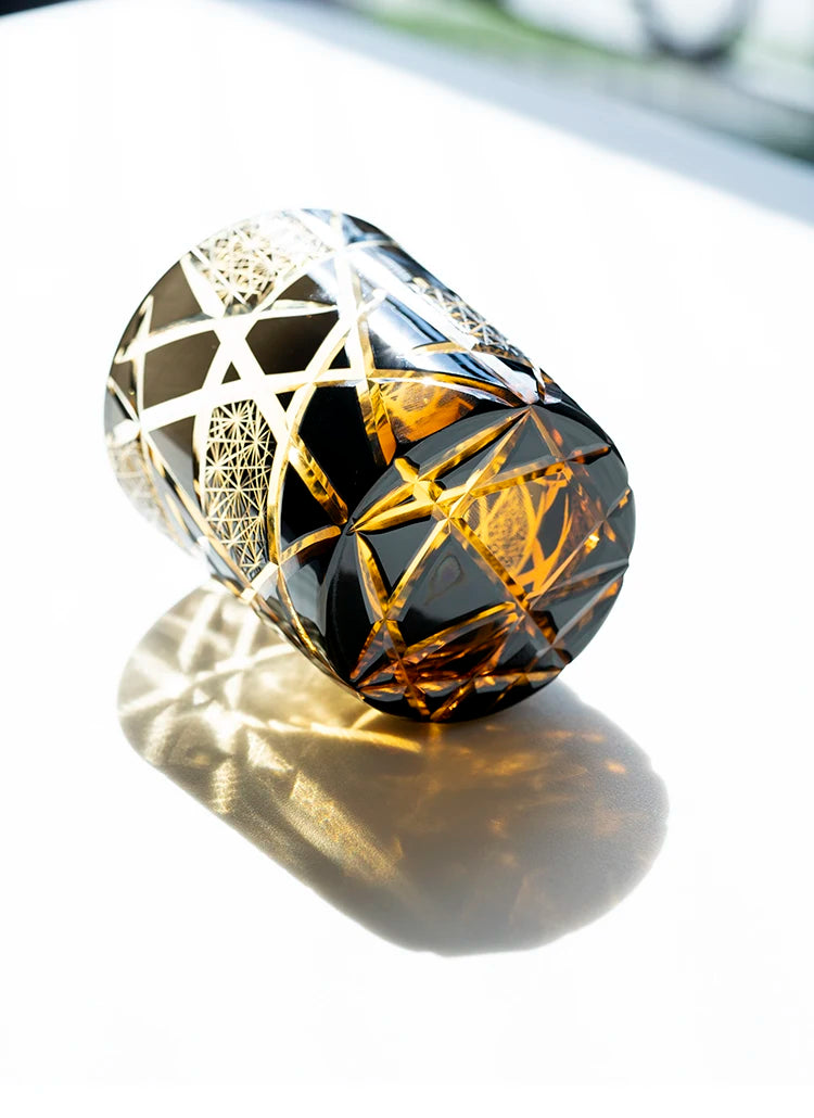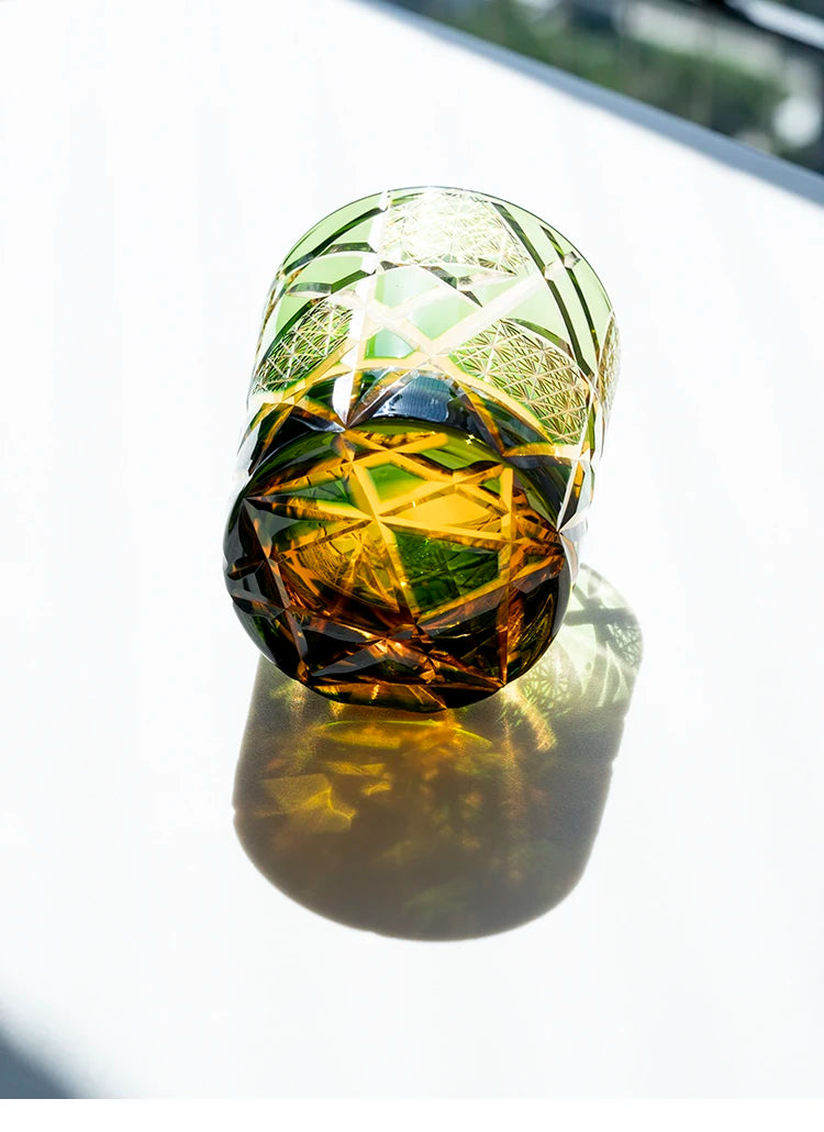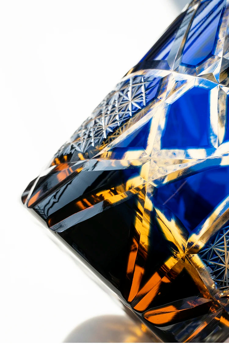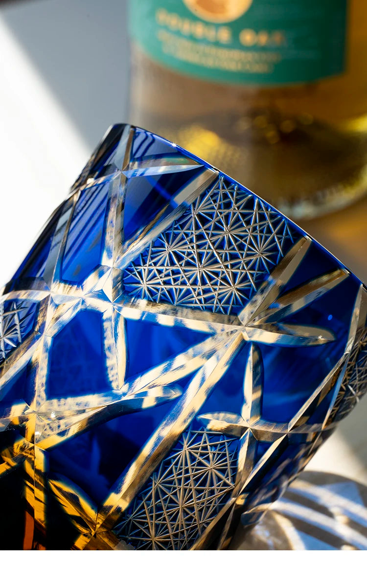 Experience the beauty of traditional Japanese craftsmanship with this Edo Kiriko-inspired hand-cut whisky tumbler. Designed in a rich gradient crystal-style finish, the glass features an intricate geometric pattern that reflects the light beautifully, giving the piece a striking, jewel-like appearance. This premium 250ml whisky glass feels weighty and balanced in the hand, with a smooth polished rim that enhances every sip of whisky, bourbon, rum or Japanese sake.