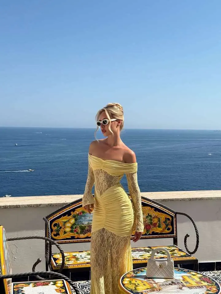 Fiolana is your statement silhouette for elevated eveningwear. Designed with an off-shoulder neckline and sheer long sleeves, this ruched lace bodycon maxi dress blends sculpted detail with delicate texture. The body is cinched with gathered panels that contour the waist and hips, falling into a sheer lace hem that adds fluid movement to every step. A standout choice for formal events, luxury parties, or as an elegant wedding guest dress, this occasion gown balances femininity with drama.