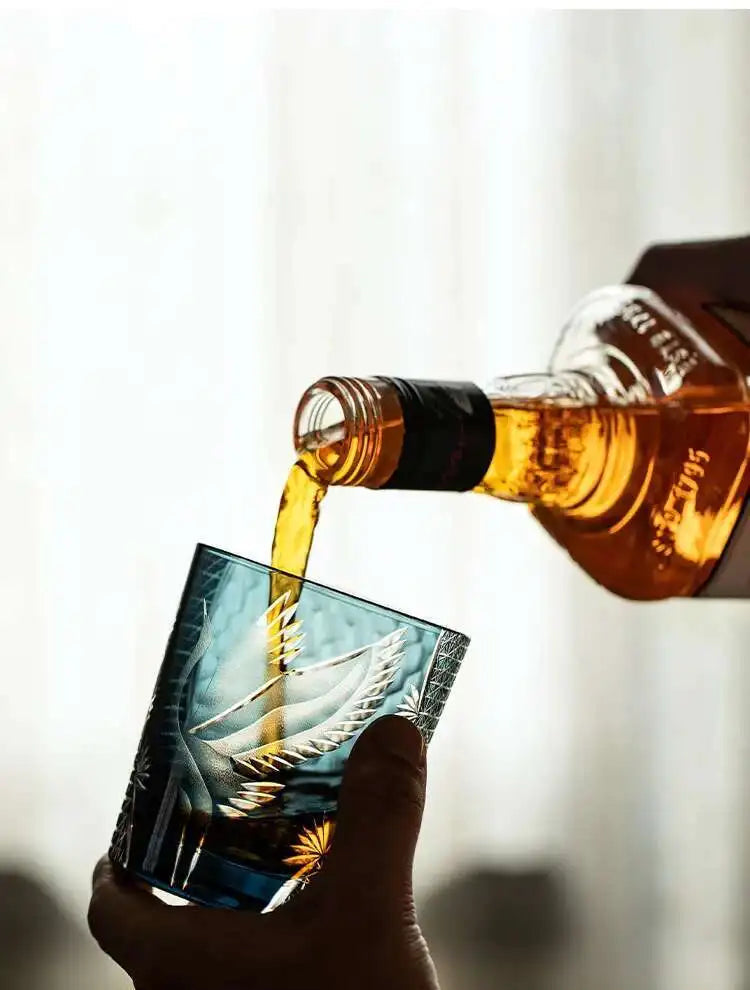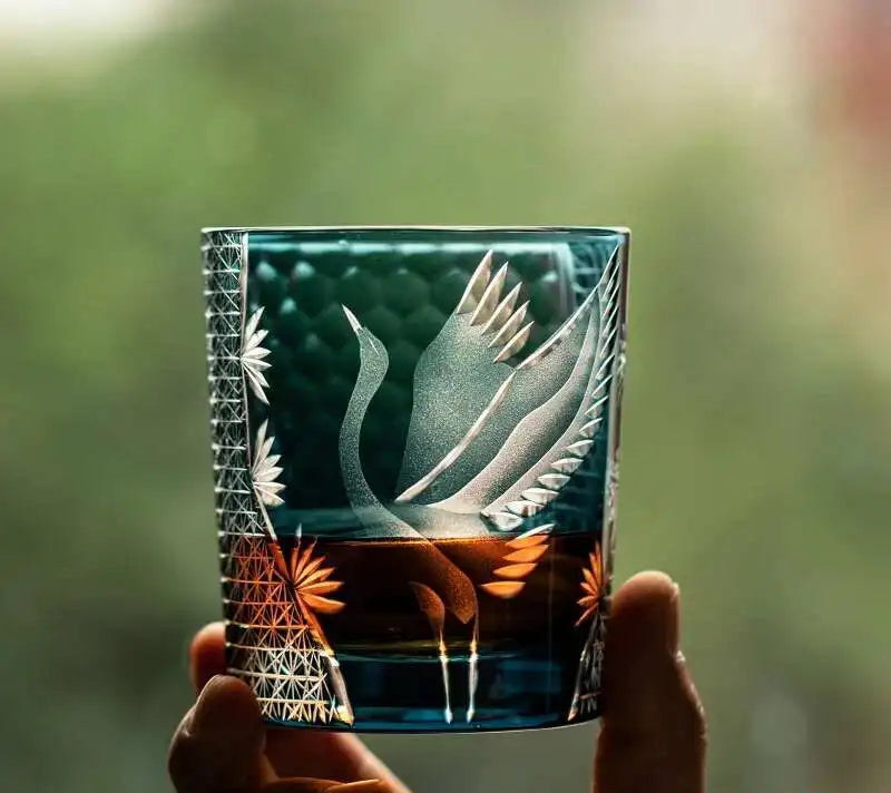 This Japanese-style Edo Kiriko whisky glass features an intricately hand-engraved crane motif, a design traditionally associated with longevity and elegance. Edo Kiriko refers to a historic Japanese glass-cutting style, recognised for its precise hand-engraved patterns that enhance light reflection and visual depth.