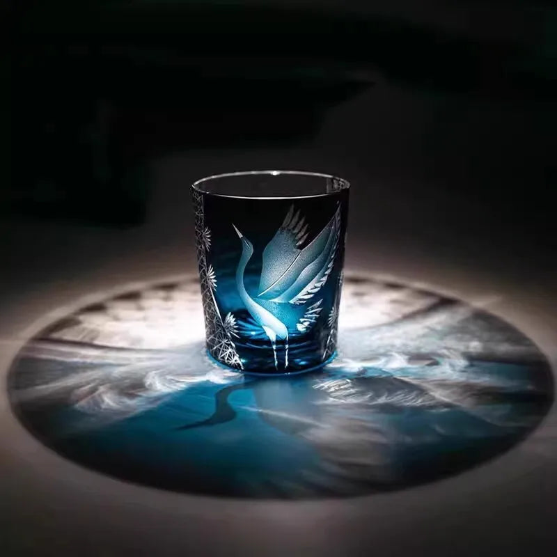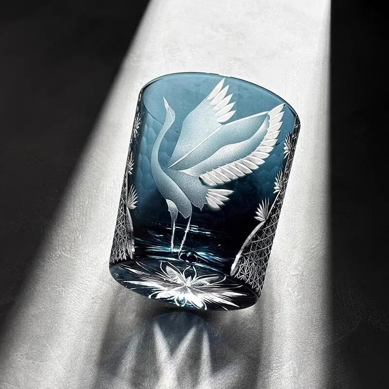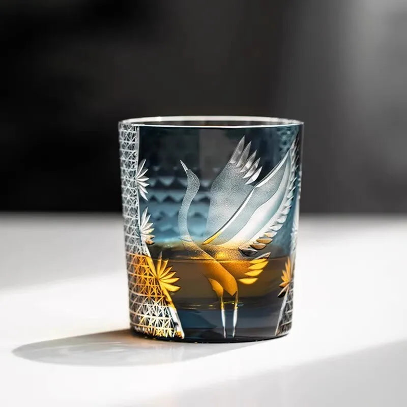 Japanese-Style Edo Kiriko Hand-Engraved Whisky Glass with Crane Motif – Crystal Glass Tumbler with Gift Box (260ml)