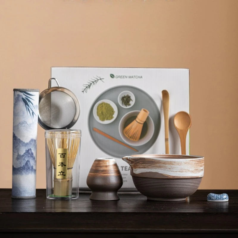 A bamboo matcha whisk supports even mixing and a smooth texture, while the bamboo scoop and fine mesh strainer assist with accurate measuring and sifting. A ceramic whisk holder helps maintain the shape of the whisk between uses, and a matcha preparation mat completes the set for everyday matcha preparation.
