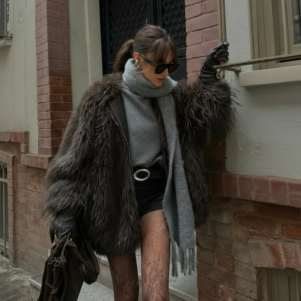 A cold-weather essential with high-impact edge, the Maevra jacket is crafted in ultra-soft Mongolian-style faux fur with a rich mocha tone that flatters every skin tone and outfit base. Its oversized fit, dropped shoulders and plush, long-pile texture create that off-duty model energy seen across this season’s most-wanted outerwear edits.