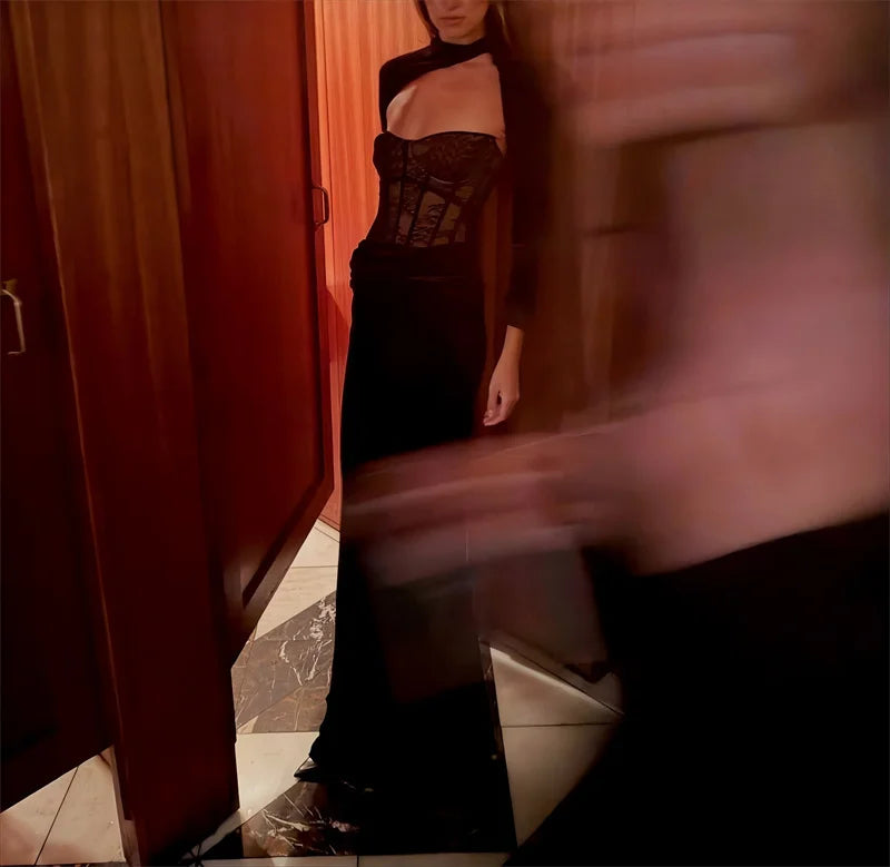 The lace corset brings precision through the waist and neckline, offering a confident outline ideal for women seeking a modern corset evening gown or an elegant strapless maxi dress with refined detail. The detachable shrug adds styling flexibility, allowing the dress to move from a sleek occasion look to a more covered evening silhouette without losing its impact. The fabric has a slight stretch, helping maintain its close fit while ensuring comfort throughout the night.
