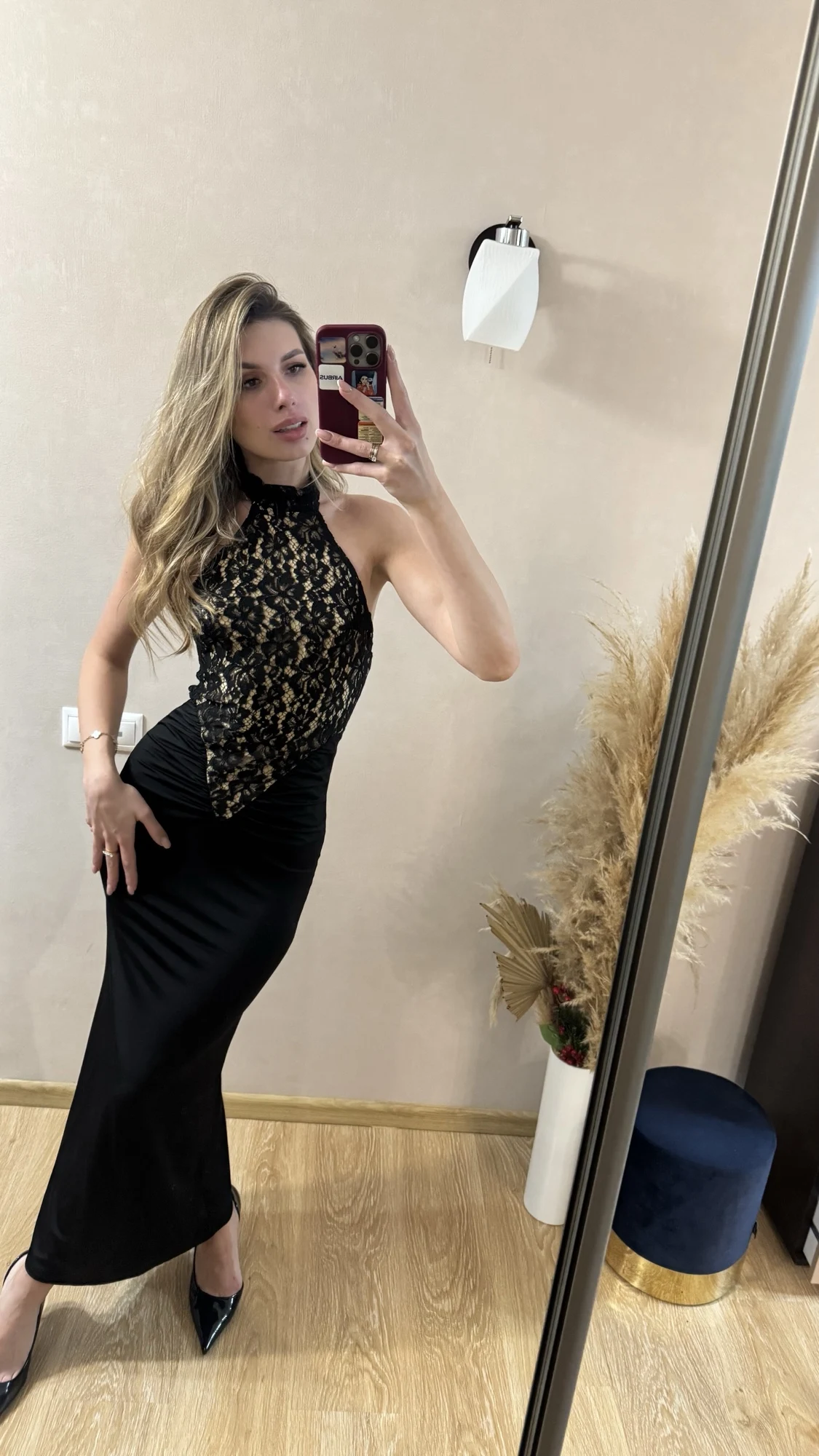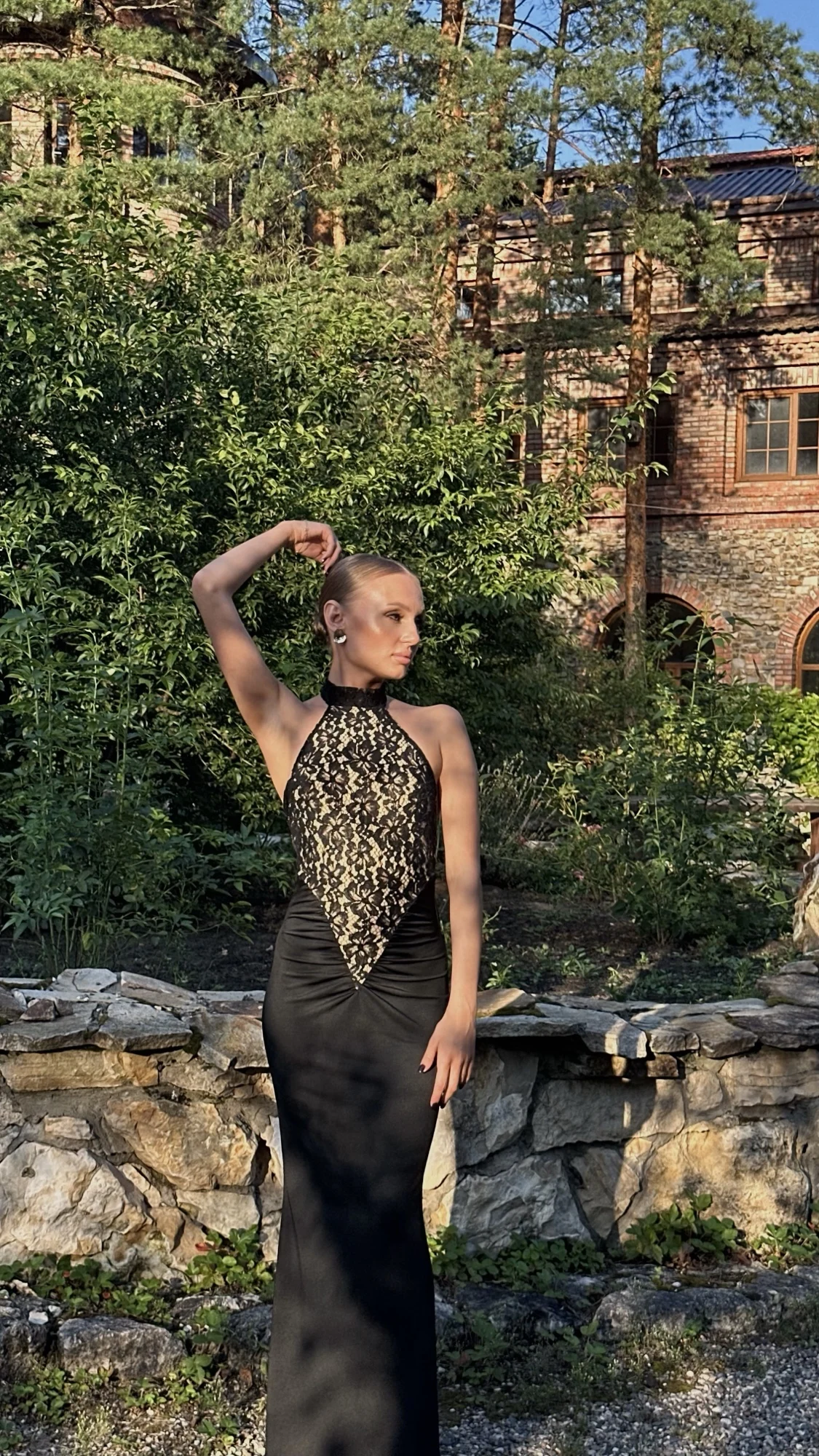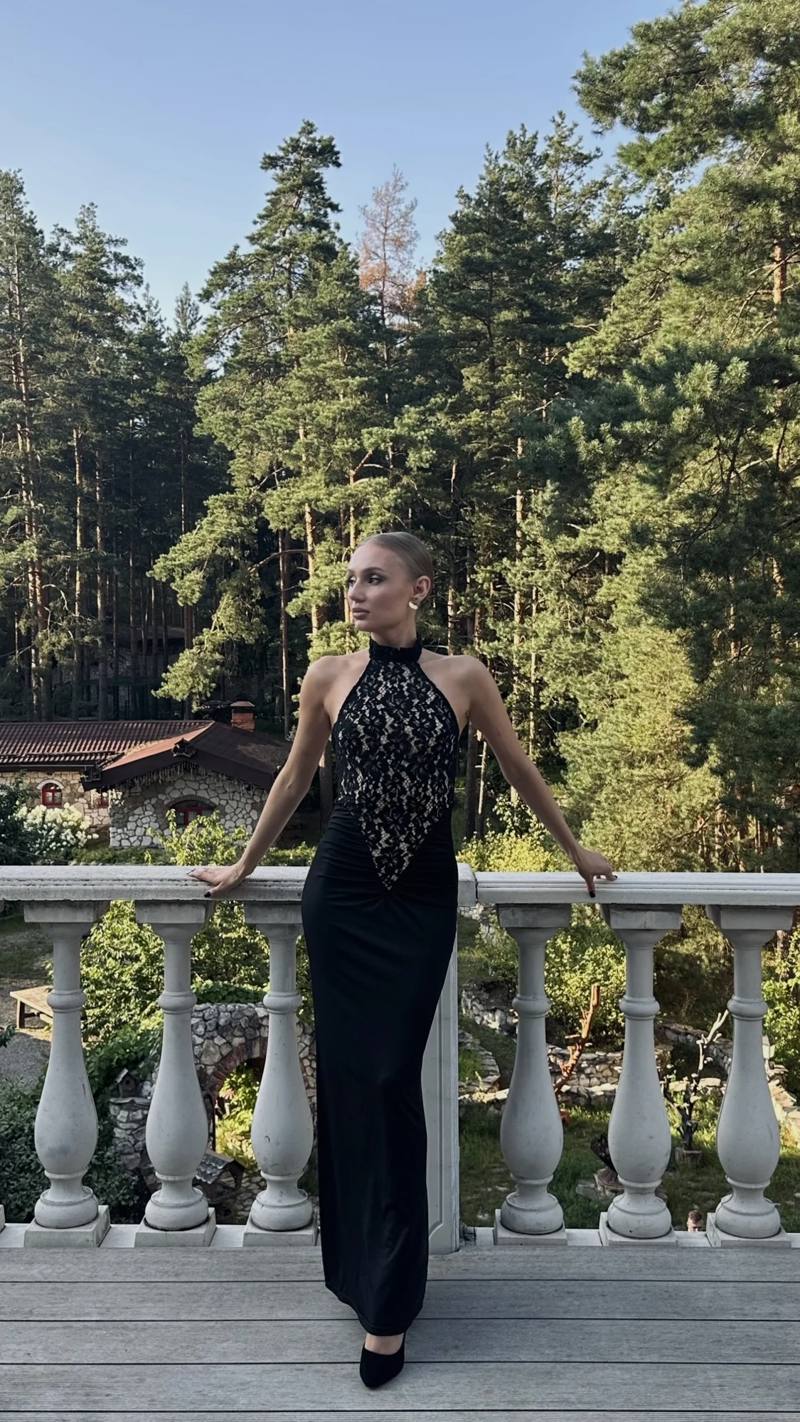 Make a statement in our Orlina maxi dress – the ultimate black lace gown for event dressing and after-dark allure. Designed with a figure-hugging silhouette and high halterneck cut, this dress features a sheer floral lace panel across the bodice, subtly revealing skin while enhancing your shape. The open back adds drama, while the full-length skirt skims the floor with effortless elegance.