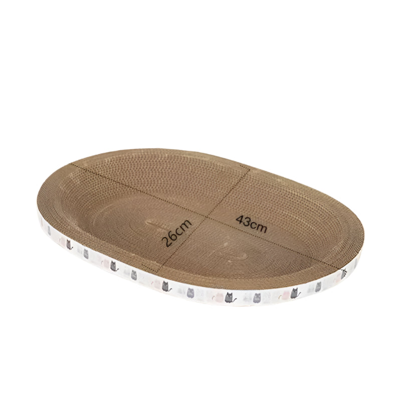 This adaptable oval cat scratcher bed is made of long-lasting and environmentally friendly corrugated cardboard. It is designed to serve as both a comfy resting location and a scratching surface, satisfying your cat's natural urge to scratch while keeping their claws healthy. The wide, circular design provides comfort for cats of all sizes, and the durable construction ensures long-term use. Ideal for playing, relaxing, and protecting your furniture from scratches.
