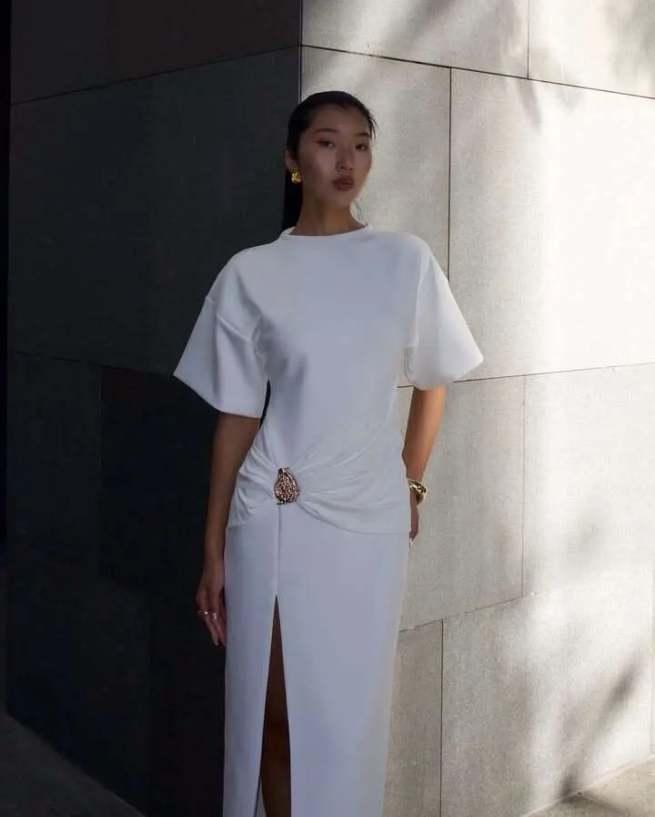 This silhouette is made for elegant parties, red carpet moments, and black-tie occasions. The smooth drape contours the frame while the structured shape offers a powerful, tailored look from every angle.