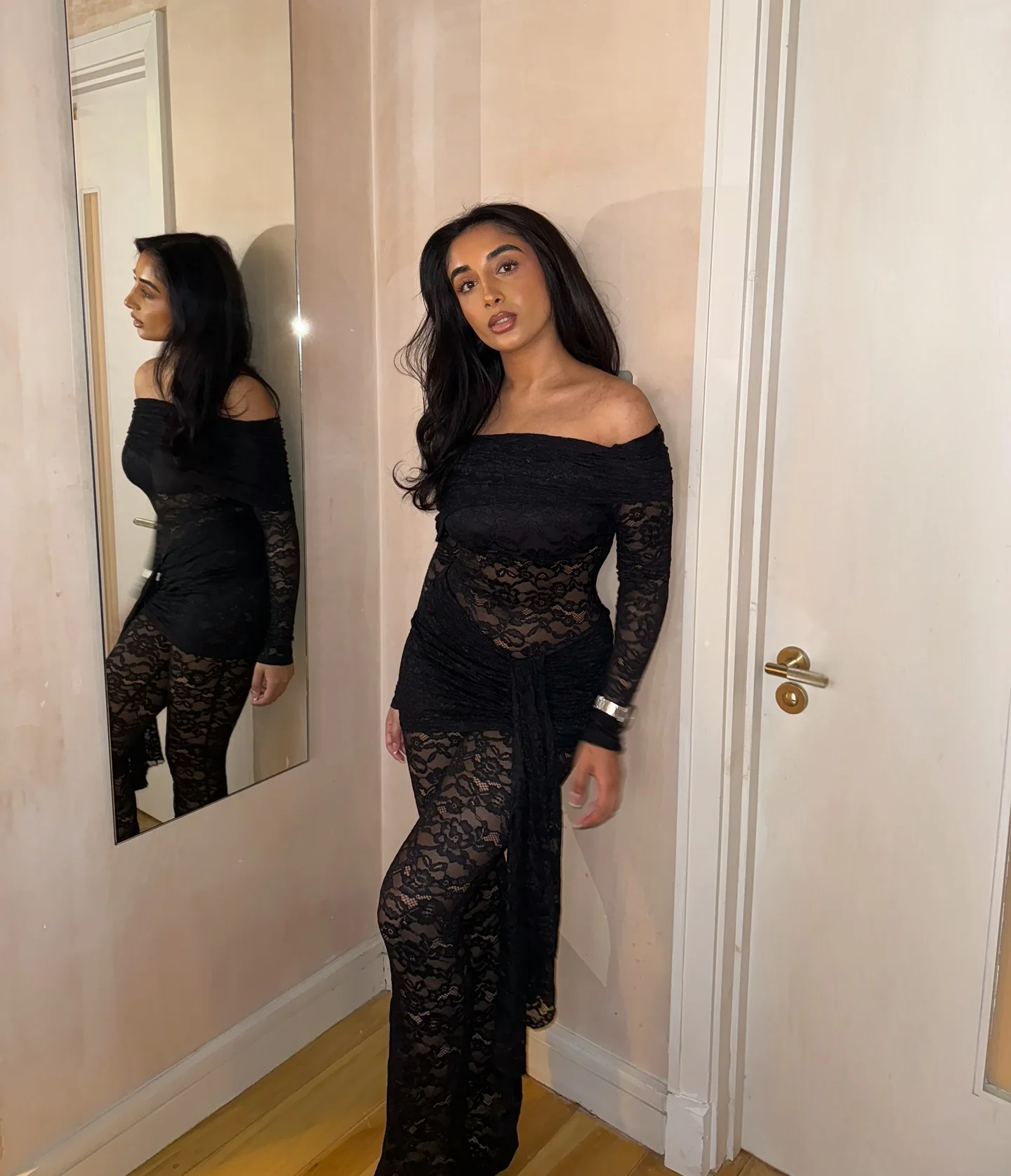 Valerisse is designed to captivate with its striking lace and sculpting silhouette. Cut from delicate sheer lace, this off-shoulder jumpsuit contours the body with a flattering high-waist fit and softly draped waist detail that enhances the natural shape.