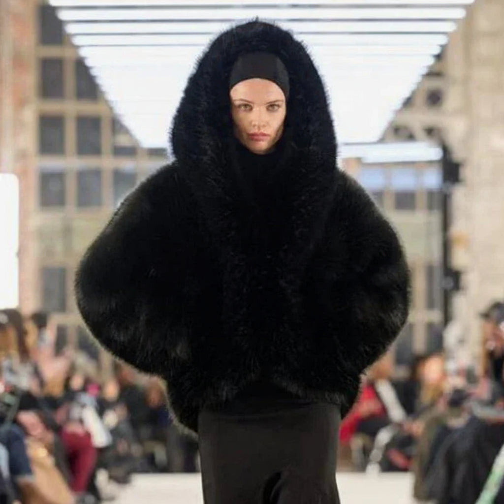 The Vossara Hooded Plush Faux Fur Coat delivers a dramatic winter statement with its oversized silhouette, deep sculpted hood and ultra-soft plush faux fur finish. Designed for women who favour high-impact glamour, this piece blends warmth, comfort and modern runway style in one standout winter jacket.