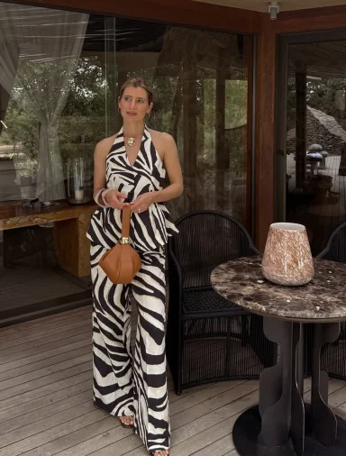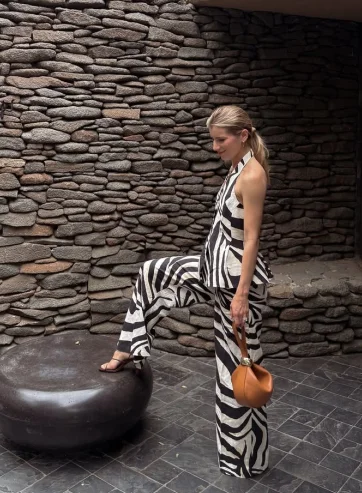 Zaraya Zebra Print Halter Waistcoat & Wide Leg Trousers Co-Ord – Bold Monochrome Two Piece Outfit for Summer and Holiday