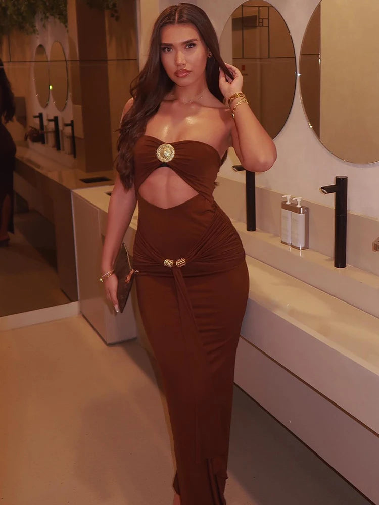 Turn heads in the Zarela strapless maxi dress – a stunning occasion gown that blends glamour, elegance, and seductive detail. This bandeau evening dress features a sweetheart neckline with a cut-out front, ruched gathering at the waist, and cascading draped detail that flows into a floor-length silhouette. Accented with gold-tone hardware at the bust and hips, Zarela sculpts your figure while creating soft, fluid movement. Ideal for wedding guests, prom, black-tie events, or holiday evenings, this formal maxi dress is the perfect mix of contemporary styling and timeless allure. Pair it with metallic heels and statement jewellery for a red-carpet-worthy finish. A must-have for your summer wardrobe or special occasion edit.